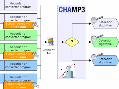 CHAMP3 tries to classify MP3 sources through statistical means: The use of approriate detection algorithms increases steganalytical reliability.